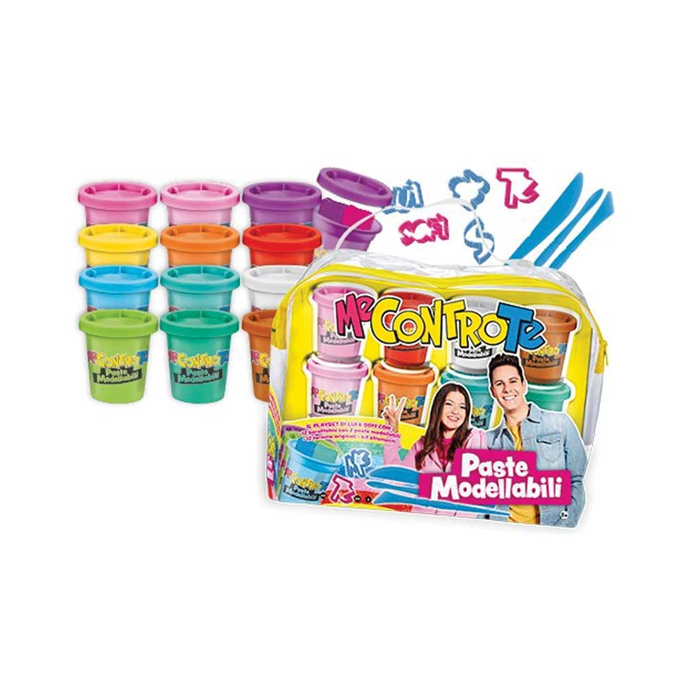 Un bellissimo set contenente 12 barattoli di pasta da modellare e accessori contenenti tutti in una comoda valigetta. Me Contro Te Valigetta 12 Paste Modellabili contiene: 12 barattolini con all' interno 2 paste modellabili di colore diverso; 1 set azzurro o magenta di formine; 1 set di 3 strumenti azzurri e 3 strumenti magenta per lavorare le paste modellabili.