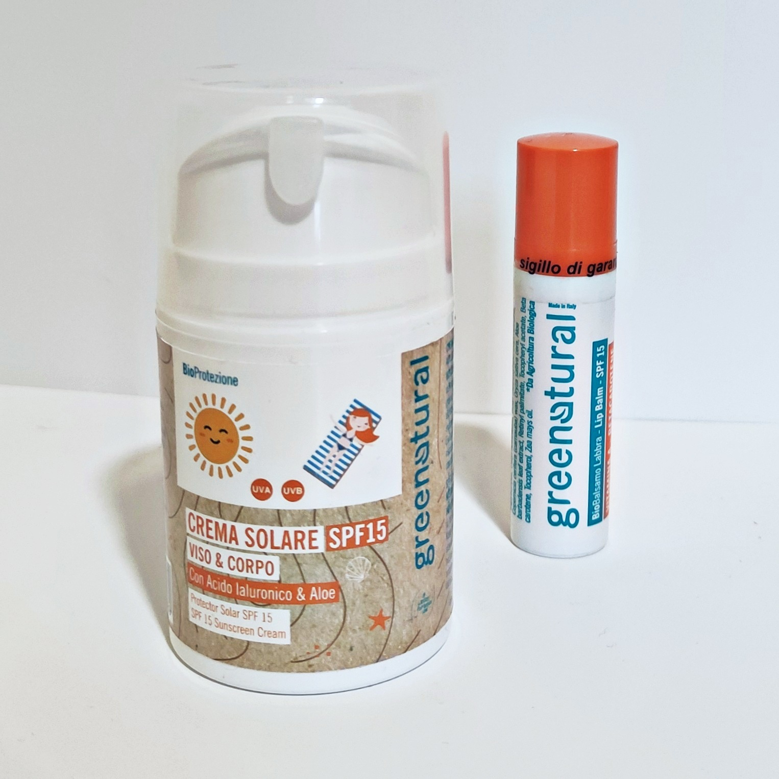 Protezione Media - UVA UVB + Balsamo labbra SPF15 OMAGGIO Proteggi la tua pelle con il solare Greenatural spf 15. • Solo filtri fisici minerali naturali (non nano): schermano i raggi solari per un'adeguata protezione UVA e UVB. • Formula fluida facilmente spalmabile: può lasciare una leggera patina bianca che è garanzia di efficacia e consente di verificare di aver steso bene il prodotto senza lasciare zone scoperte. • Protegge la tua pelle dal fotoinvecchiamento precoce. • Con Acido Ialuronico e Aloe. • Senza profumazione: formulato per ridurre i rischi di allergie. LISTA INGREDIENTI Ingredients: Aqua, Isoamyl cocoate, Dicaprylyl carbonate, Glycerin, Titanium dioxide, Cetearyl alcohol, Glyceryl stearate, Sodium cetearyl sulfate, Silica, Caprylic/capric triglyceride, Prunus amygdalus dulcis oil, Vitis vinifera seed oil, Jojoba esters, Helianthus annuus seed oil, Xanthan gum, Helichrysum italicum extract, Aloe barbadensis leaf juice*, Zinc oxide, Sodium hyaluronate, Tocopheryl acetate, Benzyl alcohol, Ethylhexylglycerin. *Da Agricoltura Biologica MODO D'USO Applicare il prodotto sulla pelle prima dell’esposizione al sole. Riapplicare dopo il bagno e più volte al giorno.
