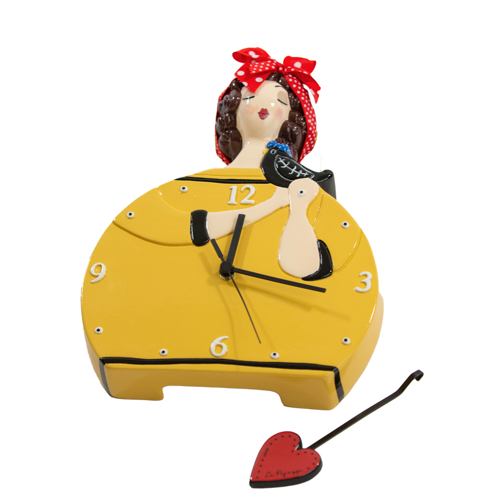 Le Pupazze di Egan si vestono di emozioni con i bellissimi colori accesi della loro passione per dare un tocco di brio alla stanza in cui lo metterete! Orologio da parete a forma ragazza formosa con camicetta gialla, con i capelli raccolti da un foulard di vero tessuto rosso a pois bianchi. Questo orologio è stato impreziosito da un bellissimo pendolo a forma di cuore rosso! Disponibili in più versioni, in tanti bellissimo colori. Misura del prodotto 22x29cm