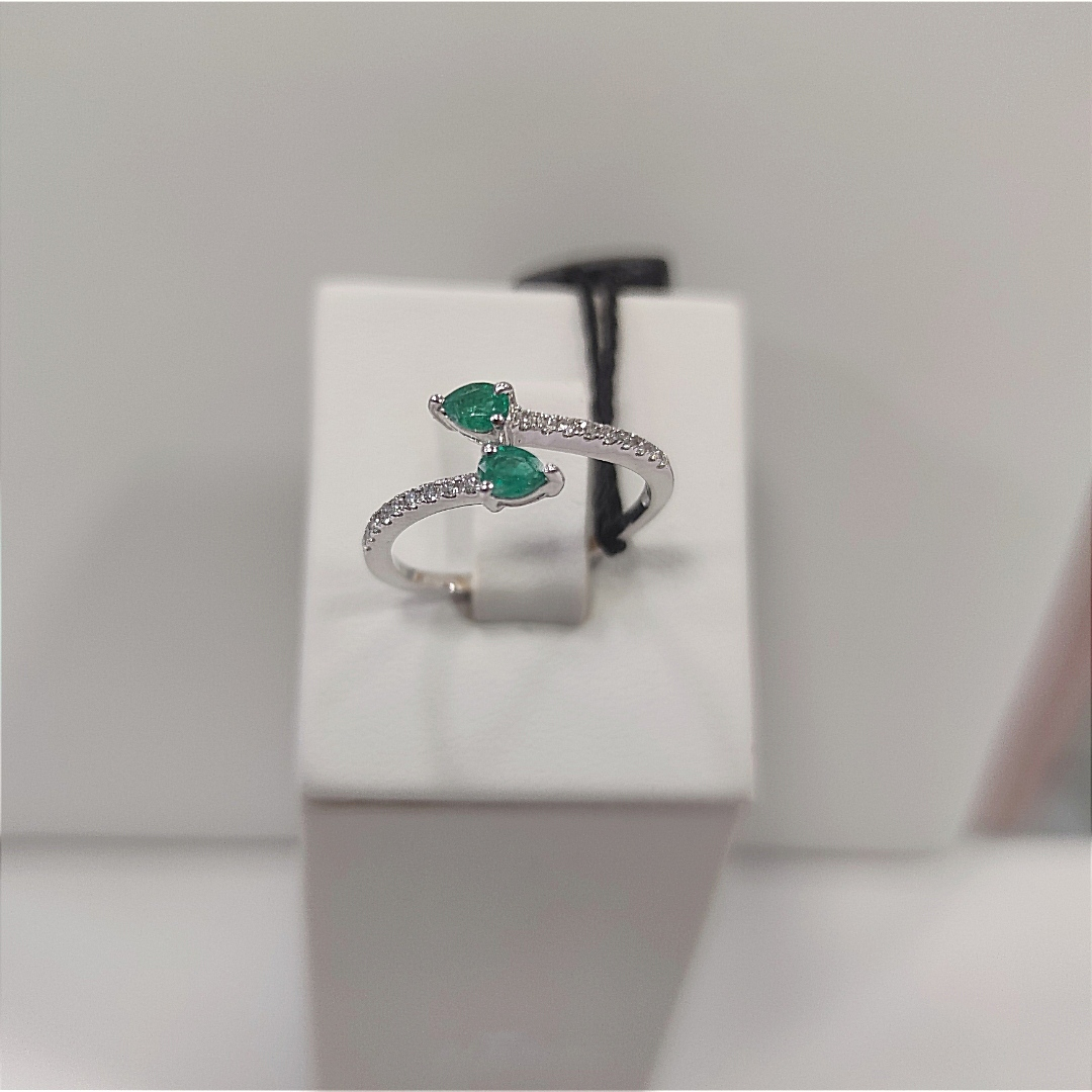 Descrizione: Anello in oro 18k grammi 3,1 monta 2 smeraldi da 32 punti di carati totali , arricchito con diamanti per una caratura di 14 punti Colore H Purezza Vs *spedizione gratuita