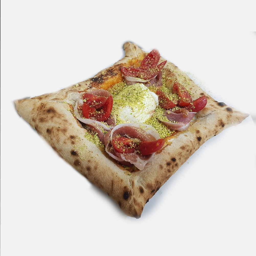 Ingredienti: bordo ripieno con crema di pistacchio, pomodoro, mozzarella, mozzarella di bufala all'uscita, ciliegina, prosciutto crudo, granella di pistacchio.