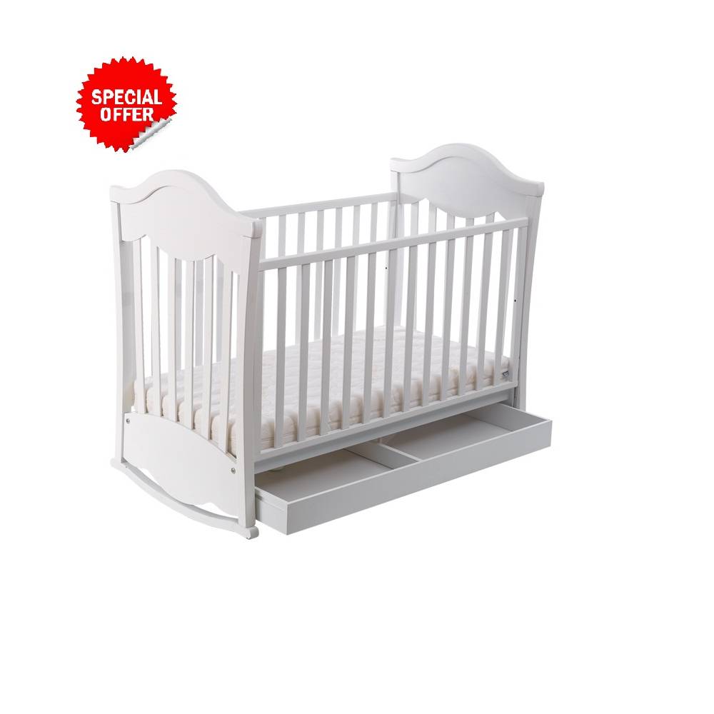 OFFERTA lettino con dondolo, ampio cassettone inferiore, suddiviso in due scomparti, e sponda che si può abbassare. La struttura solida e durevole nel tempo è verniciata con vernici atossiche… ed è 100% made in Italy! Inclusa nella confezione anche le ruote gommate antigraffio, con sistema frenante, per facilitare gli spostamenti. Età di utilizzo da 0 a 5/6 anni.