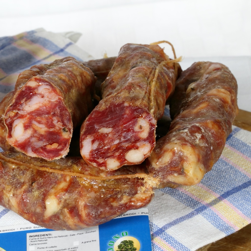 fatto con carne di Suino Nero dei Nebrodi e suino rosa, a grana media con aggiunta di sale, (mix di Zenzero fresco e secco e parte aromatica dei limoni)e aromi naturali aggiunti agli ingredienti, insaccato in budella naturali a forma di bastoncini legato con spago di colore grigio e rosso, dopo una stagionatura dai 15 ai 40 giorni il prodotto è pronto ad essere consumato. Le pezzature vanno dai 200 a 400g circa, il prodotto tracciato etichettato viene venduto sottovuoto. Prezzo al kg
