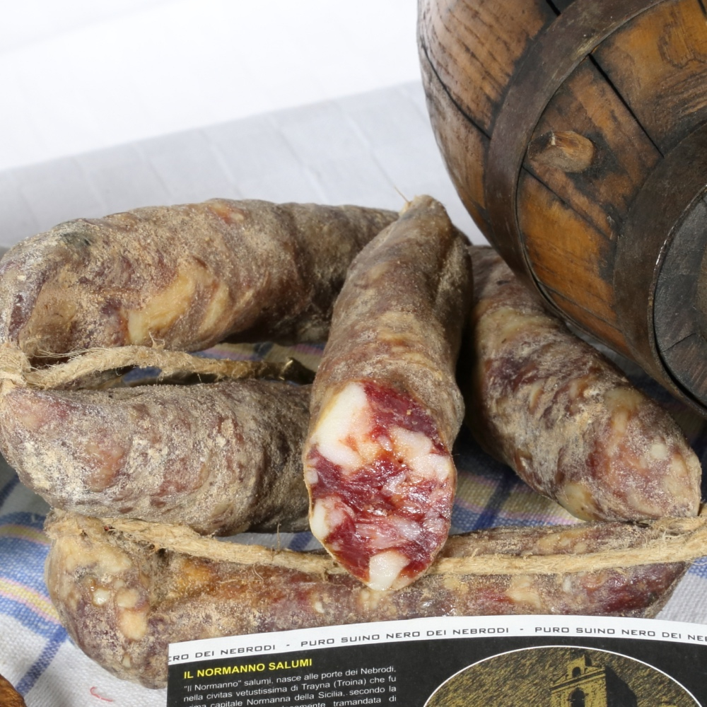 fatto con carne di Suino Nero dei Nebrodi e suino rosa, a grana media con aggiunta di sale, (funghi porcini secchi dei Nebrodi e non) e aromi naturali aggiunti agli ingredienti*, insaccato in budella naturali a forma di bastoncini legato con spago grosso avana dopo una stagionatura dai 15 ai 40 giorni il prodotto è pronto ad essere consumato. Le pezzature vanno dai 200 a 400g circa, il prodotto tracciato etichettato viene venduto sottovuoto. prezzo al kg