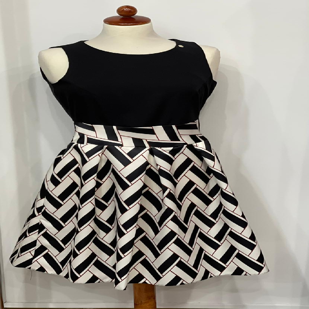 vestito smanicato di Rinascimento con gonna bianca e disegni in nero e corpetto tinta unita , taglie S\M