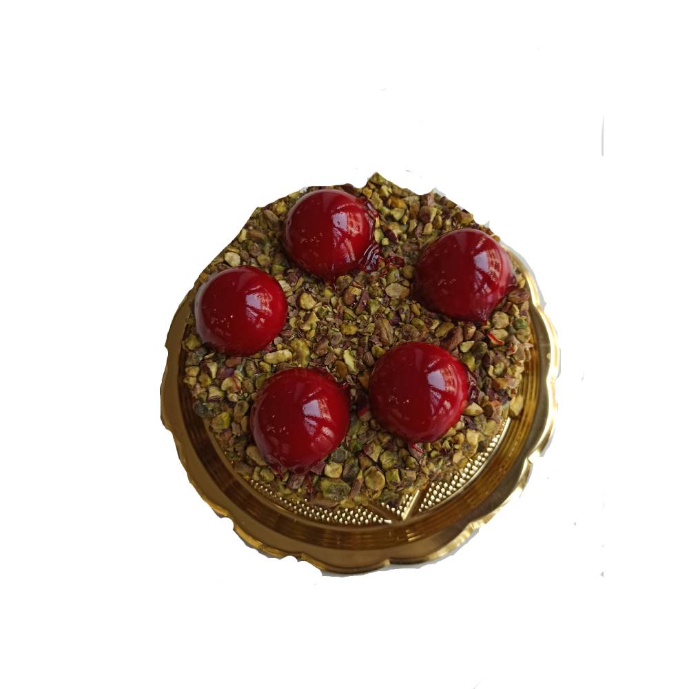 Delicata mousse di pistacchio con croccantino di pistacchio ricoperta da una granella e piccoli bon bon di vaniglia e amarena. Prezzo al kg