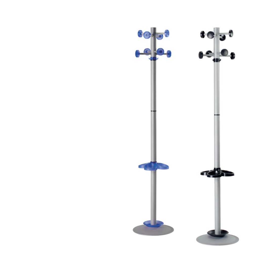 Appendiabito verniciato argento con portaombrelli e 8 pomoli in plastica colorati Disponibilità colori: argento/nero, argento/blu