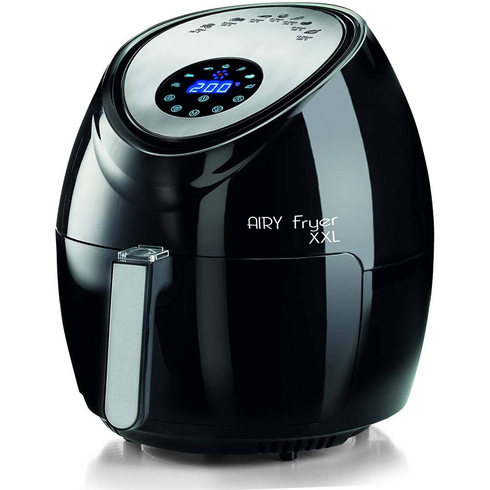 AIRY FRYER XXL NERO Friggitrice ad aria da 5,5 litri. Cuoce ad aria calda, frigge senza odori, con un solo cucchiaio di olio fino a 2,5 kg di patatine fritte in una sola volta. Temperatura regolabile max 200°. Nero