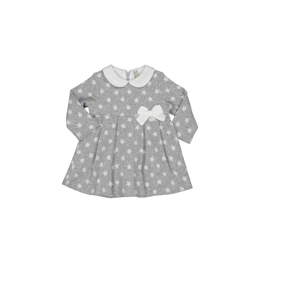 VESTITO IN MORBIDO E CALDO TESSUTO LANIERO CON STELLINE JACQUARD, MACRO FIOCCO SUL FIANCO, COLLETTO IN CONTRASTO BIANCO. APERTURA CON PRATICA ZIP SUL DIETRO. MISURE DISPONIBILI: 6-9-12 MESI