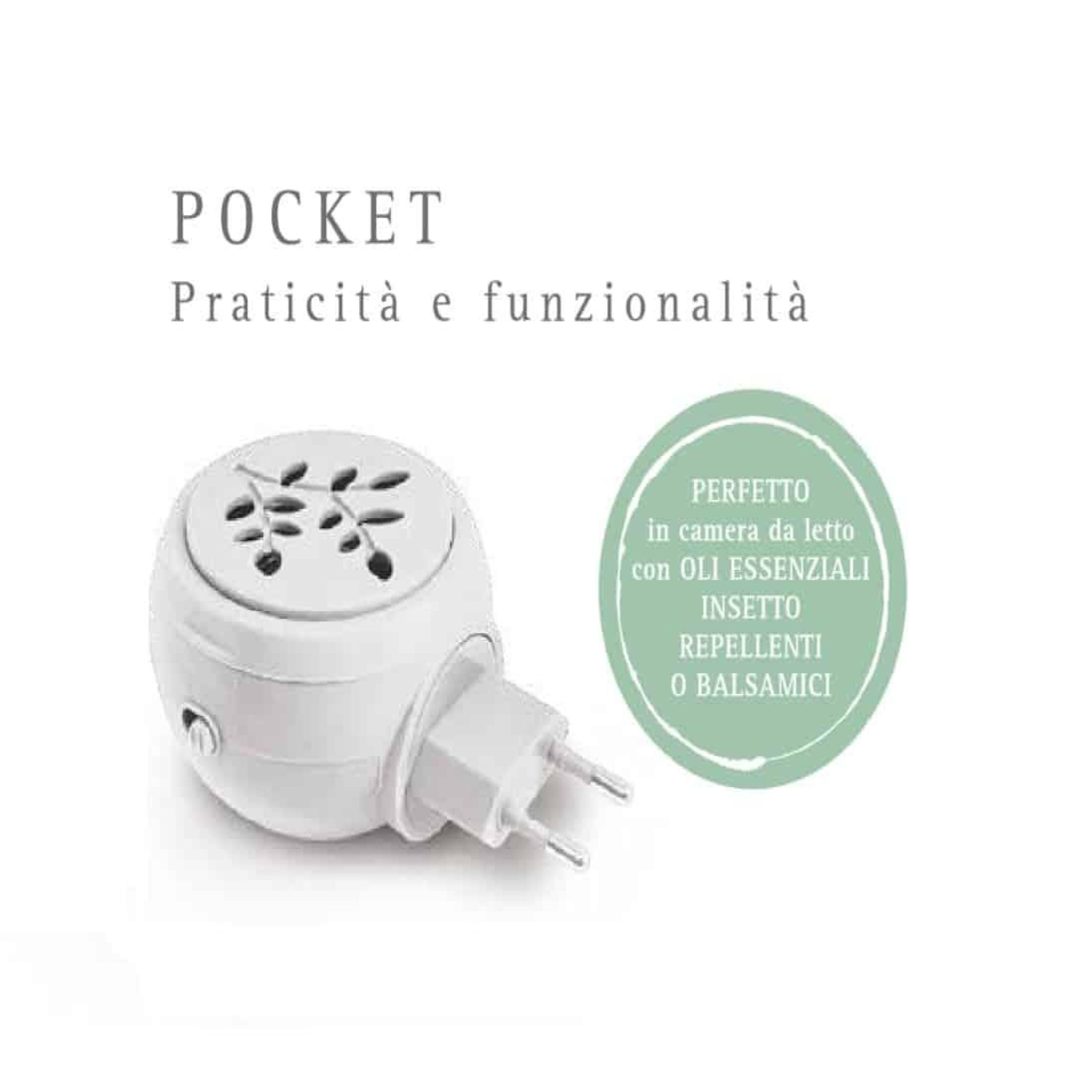 Il diffusore elettrico da muro Pocket è un sistema pratico e compatto per propagare gli oli essenziali in ogni stanza. La sua diffusione a calore controllato lo rende ideale per un utilizzo quotidiano e costante. Il diffusore Pocket con la sua spina rotabile di 90° può adattarsi a qualsiasi presa ed inoltre il coperchio traforato lo rende sicuro, soprattutto per i più piccoli, proteggendo dal contatto diretto con i liquidi.