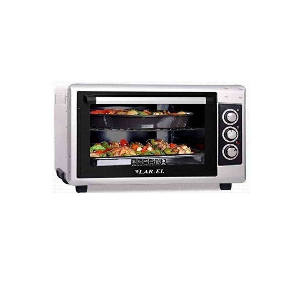 Fornetto Larel 50 Lt - Nero/Silver - Scocca bianca - In dotazione una teglia quadrata, una teglia rotonda 43 cm diametro e una griglia inox - 1500 Watt - Basso consumo - Interamente coibendato con lana di roccia - Timer con avviso acustico e spegnimento automatico - Selettore - TURBOVentola - Luce - Doppio Grill - Da 80° a 220° termostato regolabile - Porta con doppio vetro temperato per isolazione termica - Ventola escludibile - Restistenze in acciaio a lunga durata - Corpo interno smaltato porcellanato per facile pulizia 1500 Watt Ventilato Doppio Grill Luce interna tegame in regalo