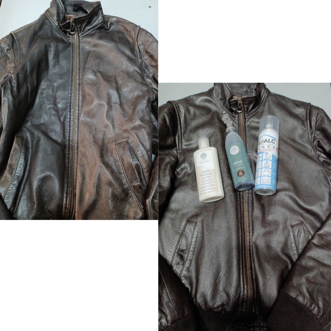 Igienizzazione con PROALC SHOES e ripristino colore giubotto in pelle con i prodotti professionali LM Professional.