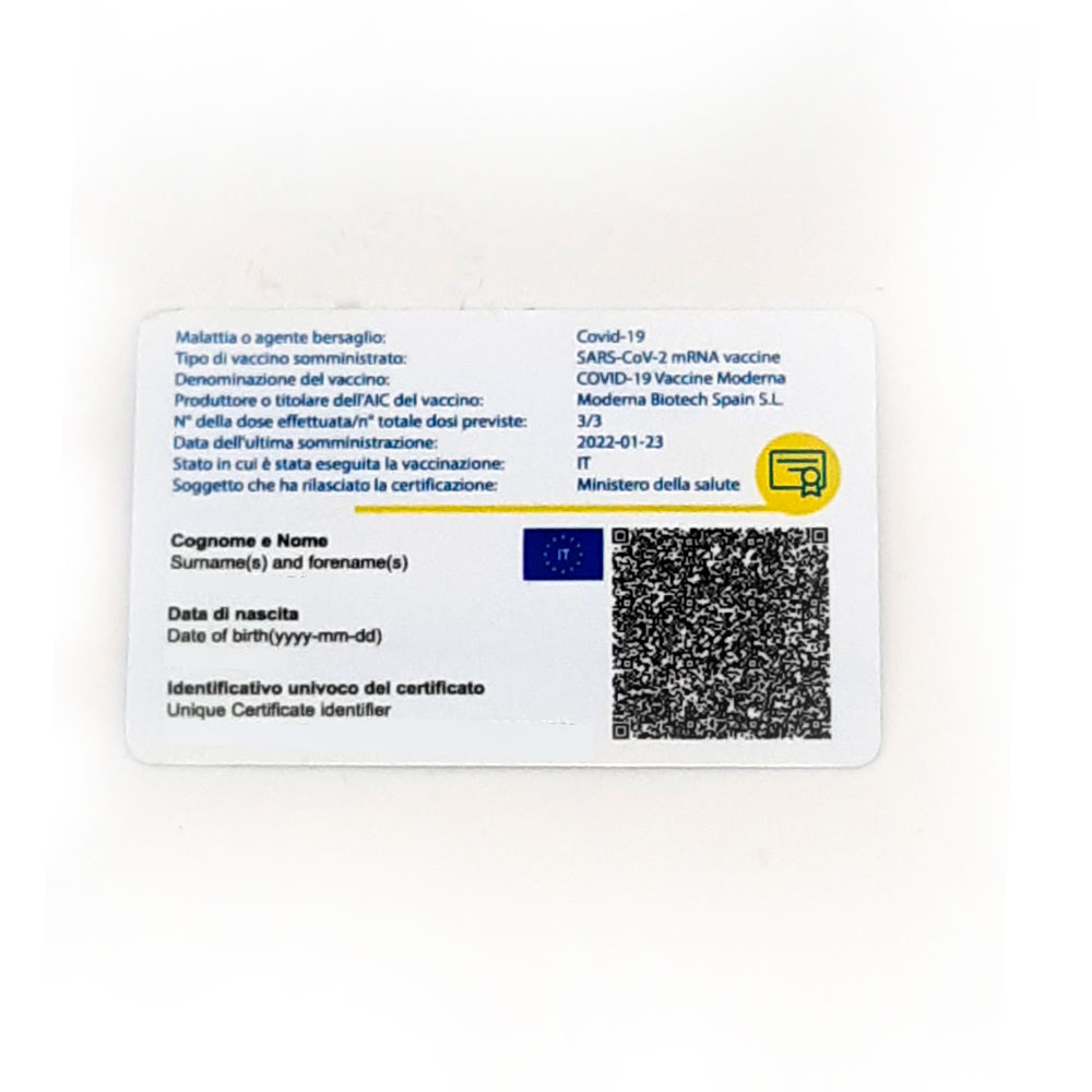 Stampa il tuo Green Pass tascabile. PVC rigido - formato cm 8.5 x 5.5 - stampa a colori UV